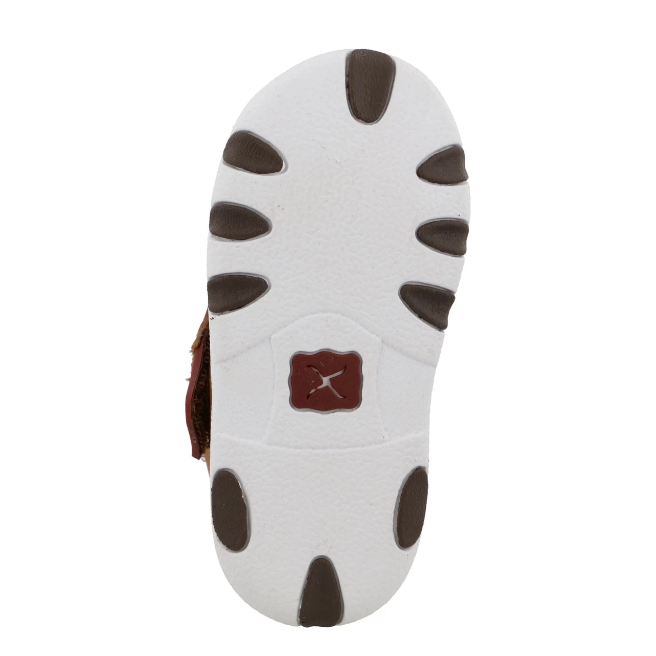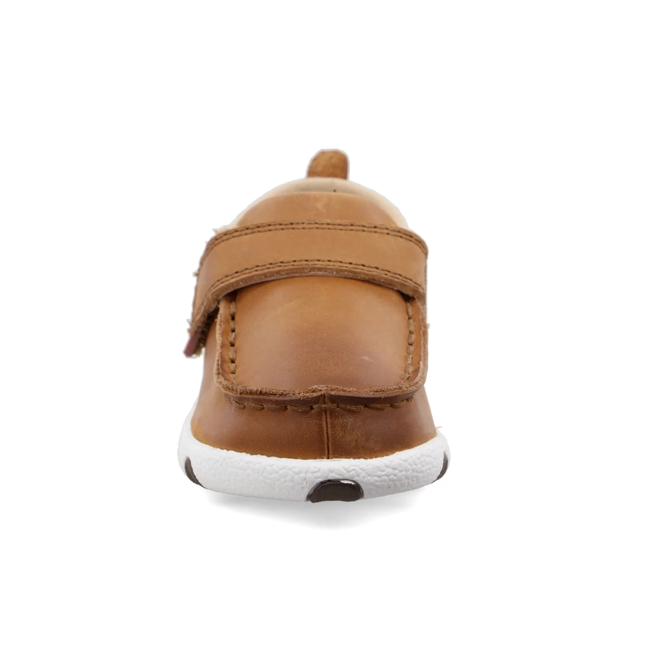 This tan Leather Velcro Driving Moc for your Infant will let your little match you and the others that wear Twisted X. Handcrafted in full-grain leather, with the same components you’ll find in any other Twisted X® driving moc collection. Your little one will experience the same superior comfort with the added benefit of a wider lightweight EVA footbed and a durable molded rubber outsole which provides improved stability and support as they grow.