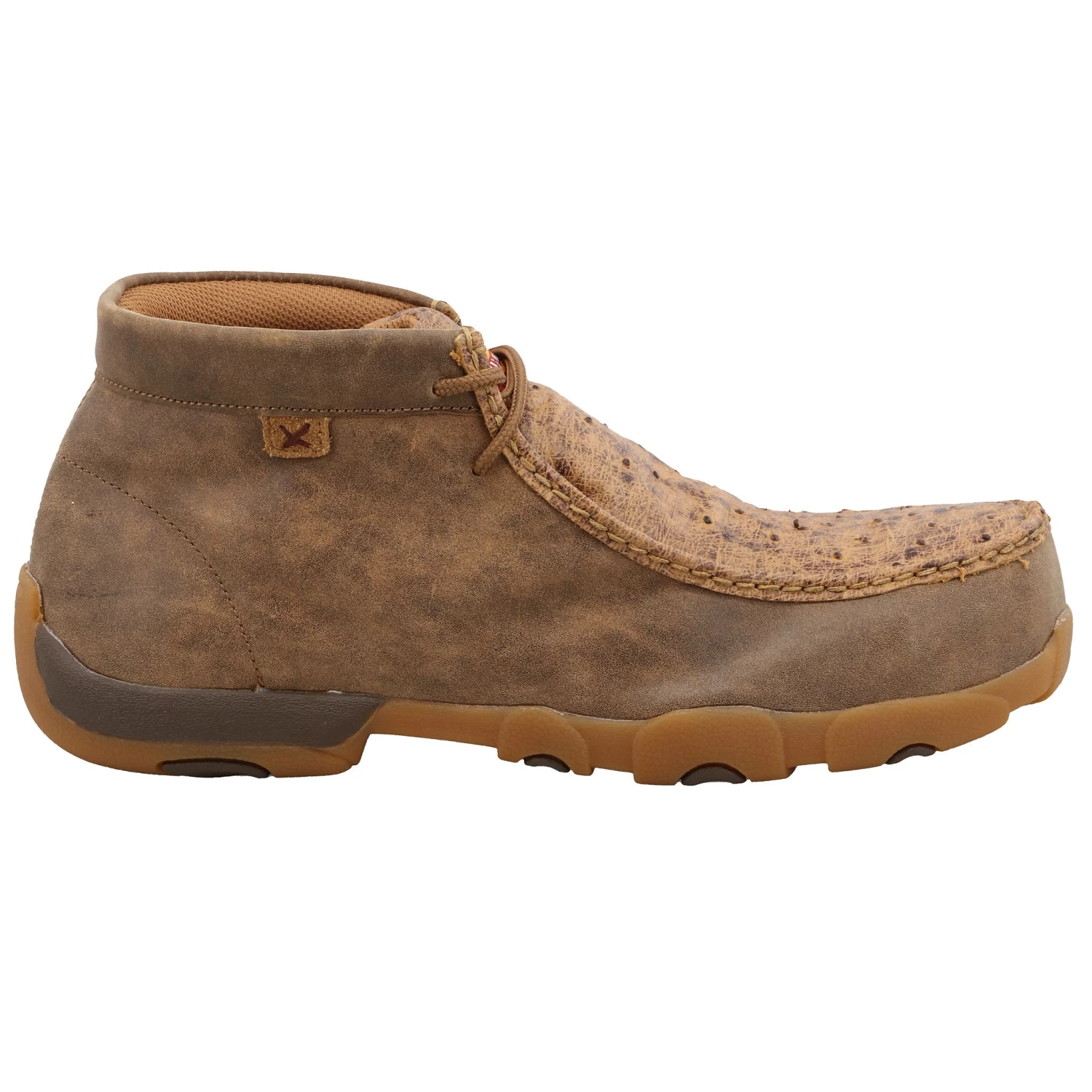 The Men’s Nano Safety Toe Work Chukka Driving Moc is a true Twisted X® Work original! Handcrafted in full-grain leather and full-quill ostrich on the vamp, along with an air mesh lining, this Work Chukka Driving Moc makes an unforgettable statement about true comfort, style, and safety in casual work footwear. This Twisted X® work version of our popular driving moc design blends a traditional open-laced chukka profile with a moc toe. The Twisted X® CellSole® comfort technology, integrated into the footbed, provides all day cushion and support. The composite insole and the Electrical Hazard rated oil and slip resistant driving moc outsole combine to produce one of the most comfortable ankle-high casual shoes you can find. Twisted X® Work footwear provides all the comfort, safety, and durability that you need to outperform any demanding work environment.