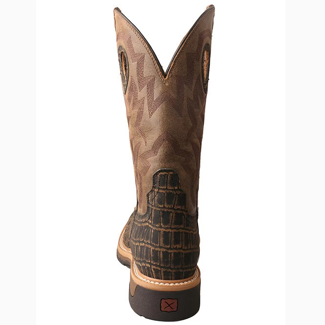 This men’s square toe boot from Twisted X will you have you feeling on cloud nine! Twisted X are known for their comfort. They have a removable insole that is antibacterial, moisture wicking, and machine washable! The toe of the boot features a dark brown caiman print!