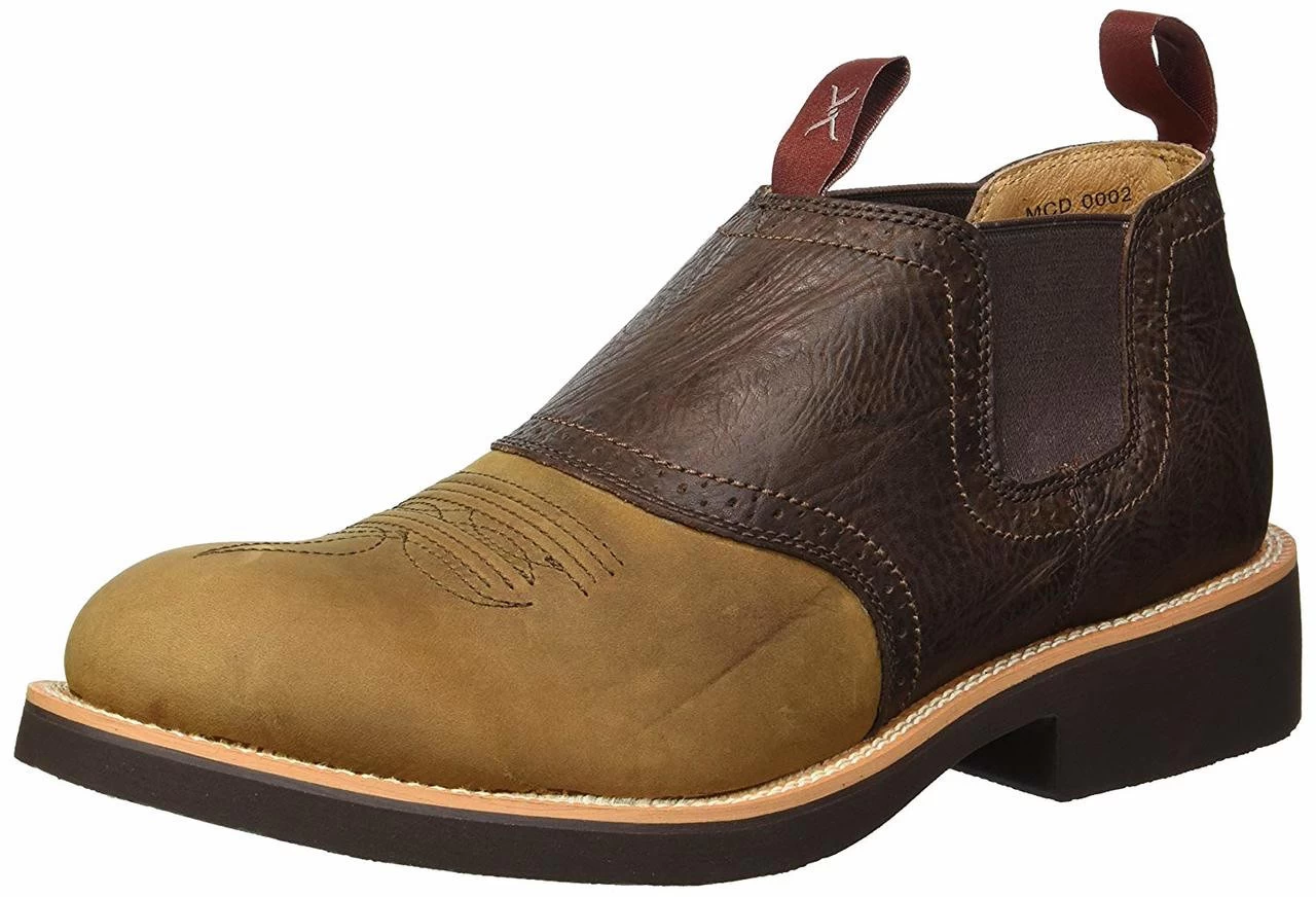 Twisted X Mens Cowdog Shoe – Distressed Saddle The Cowdog Collection is designed to look like cowboy boots, but without the hassle of a pull-on. Twin gore allows for easy slip on and off, and the Cowboy Comfort System allows for all-day wear.