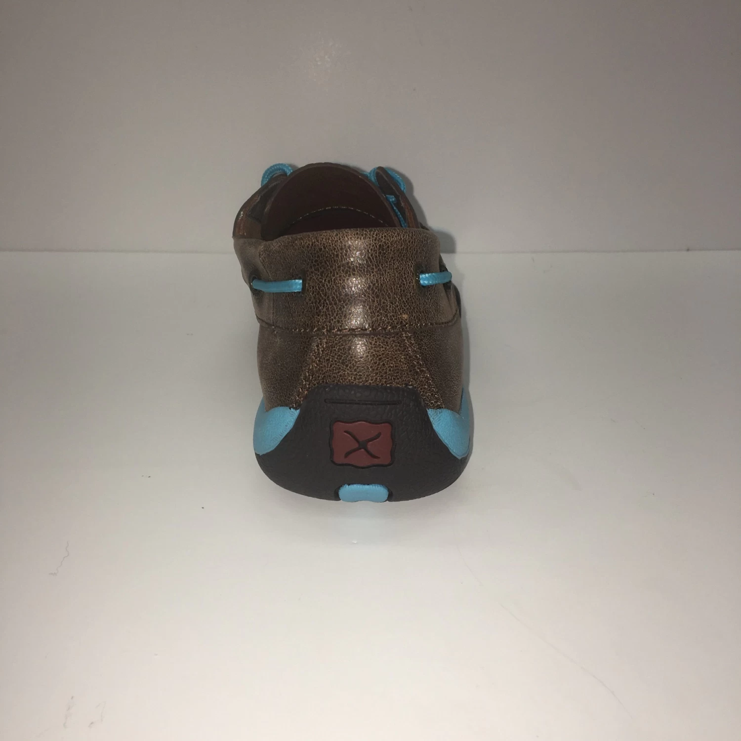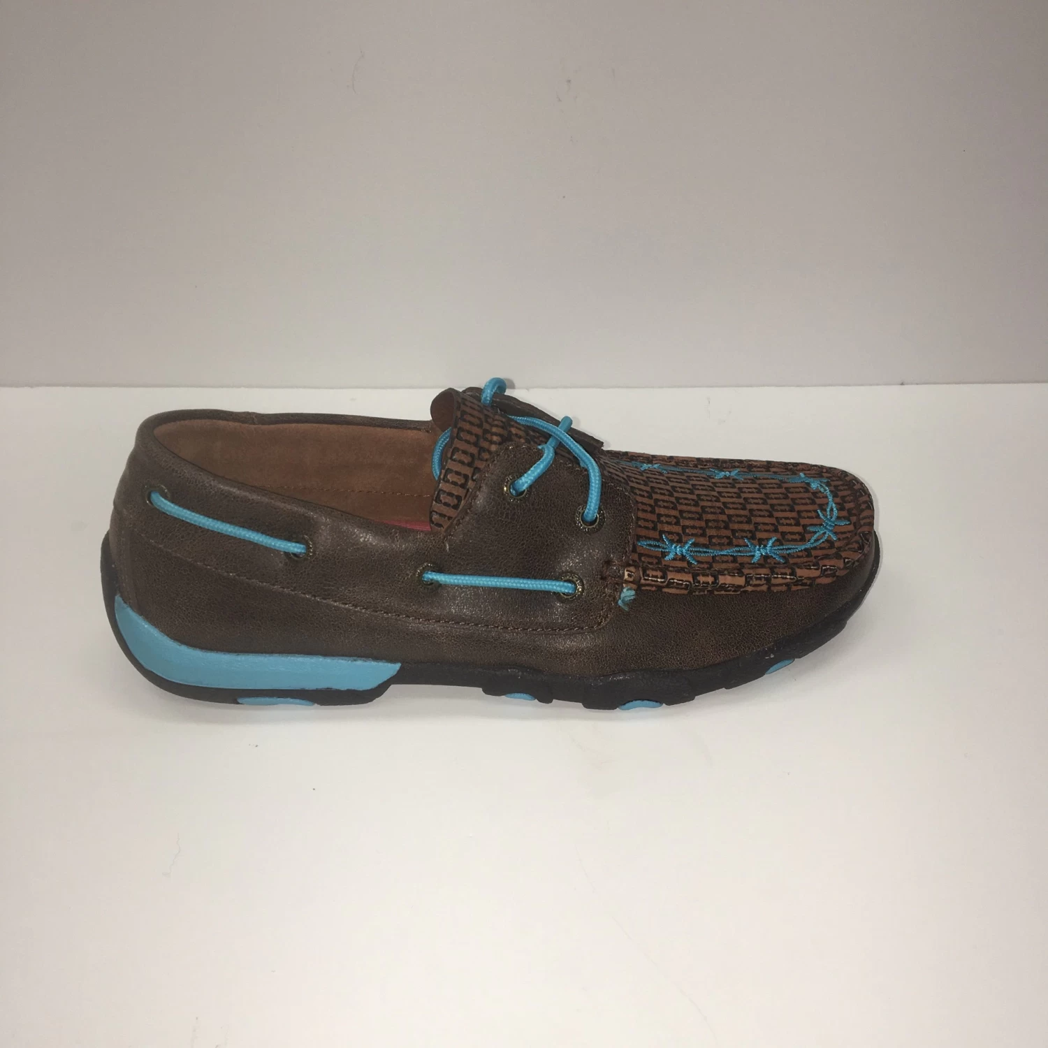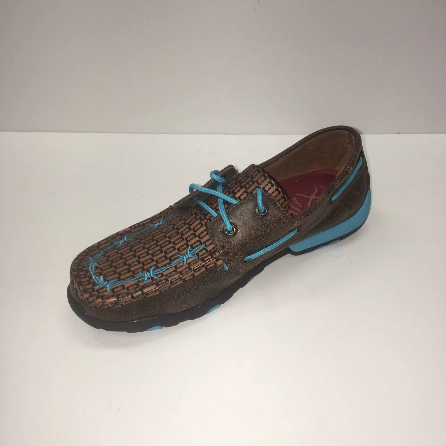 Check out these Western Edge Exclusive Driving Moc’s from Twisted X! They feature a basket weave stamped toe with a blue barbed wire design and lacing, you will only find this shoe at the Edge!Â